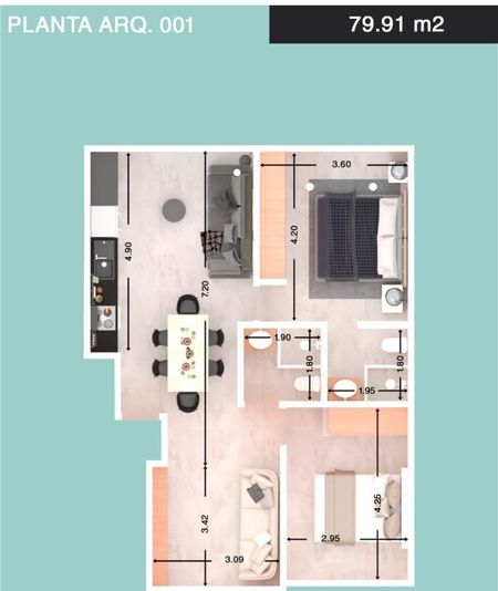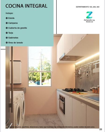 El departamento de la planta baja es de 79.91 m2 cuenta con 2 recámaras, 2 baños, sala- comedor, cocina, área de lavado y un cajón de estacionamiento.