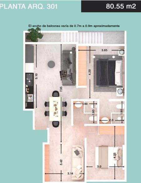 Y el departamento 301 que es de 80.55 m2 habitables, 8.25m2 de balcón y 51 m2 de Roof garden.