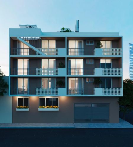 Este proyecto cuenta únicamente con 7 unidades , 1 departamento en la planta baja y dos departamentos de los niveles 1 al 3. Además tendrá 7 cajones en planta baja a nivel de piso y 2 con eleva autos, bodega, caseta de vigilancia y elevador.
