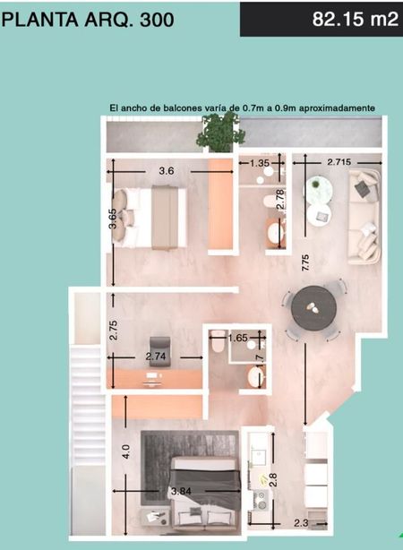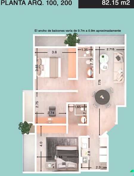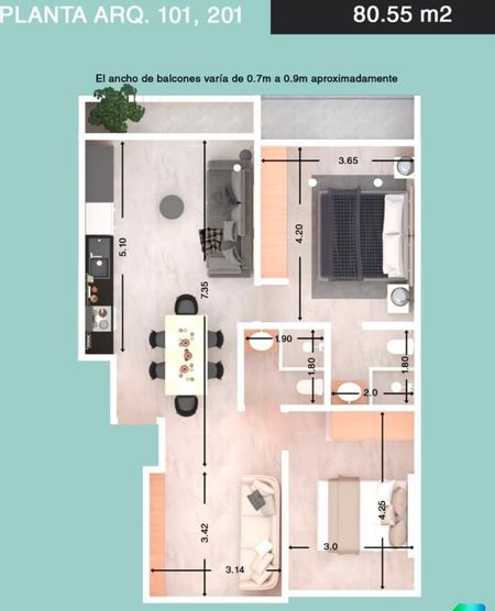 Los departamentos 101 y 201 tienen 80.55 m2 habitables y 7 m2 de balcón y cuentan con 2 recámaras, 2 baños, sala- comedor, estudio, área de lavado y estacionamiento.